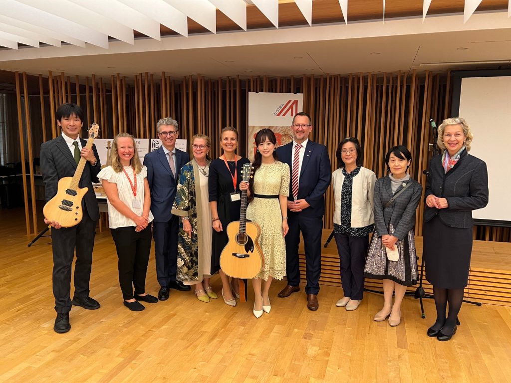 シンポジウム後はレセプション。上村さや香さんが英語でスピーチ。英語詞の投影と共に林業応援ソング「森で愛ましょう」を演奏し、会場の皆さんに国産木材ギターの響きをご堪能いただきました。