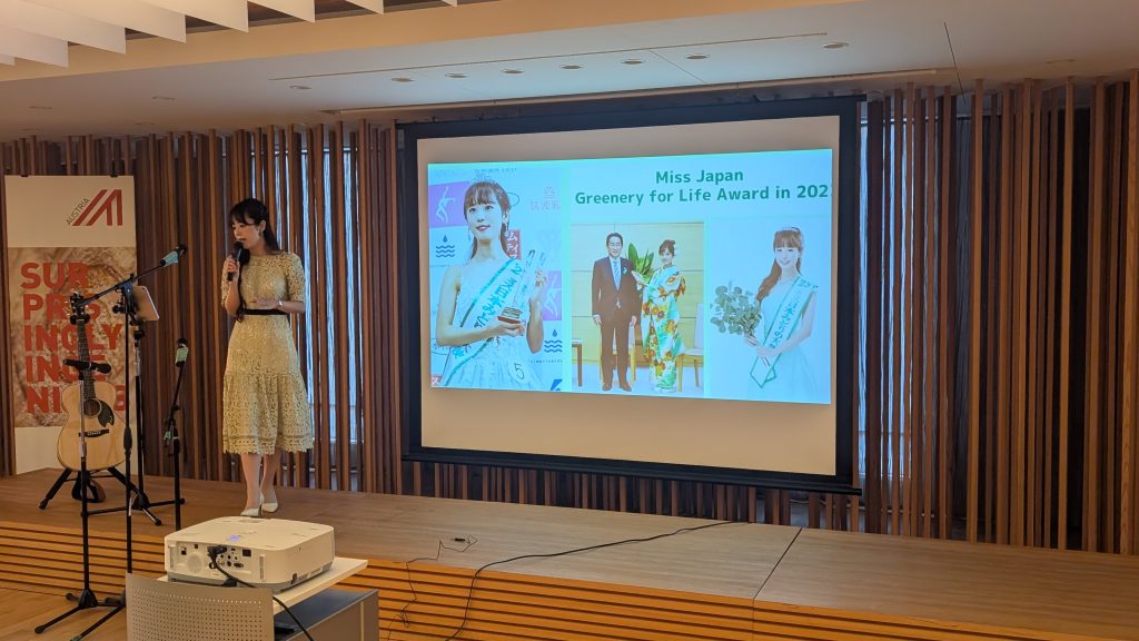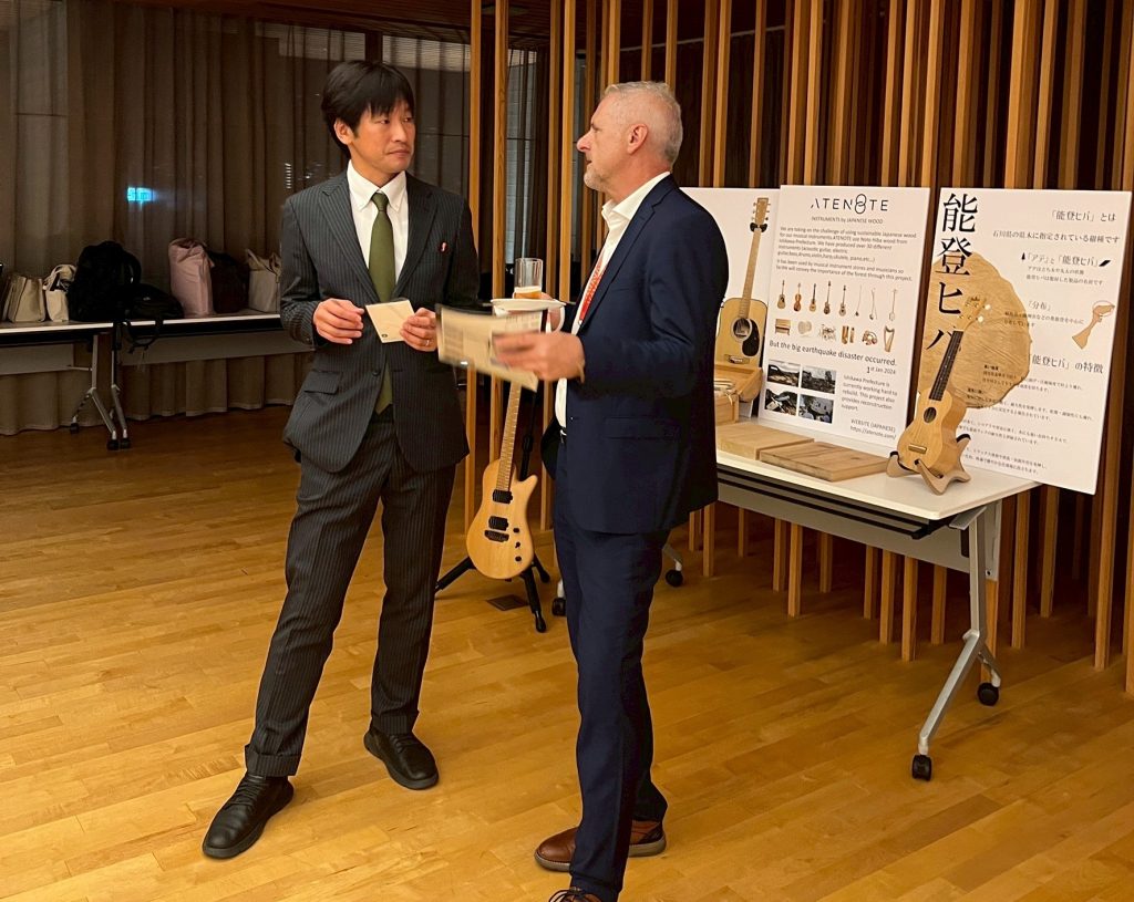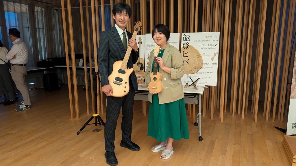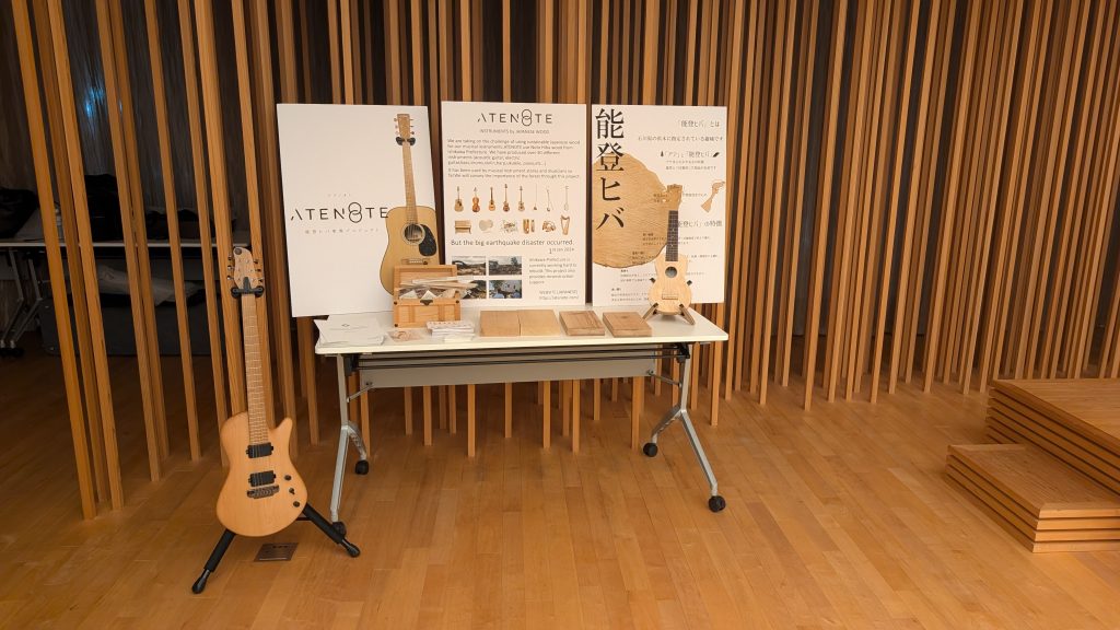 このイベントは 元林野庁で林業のコンサルを行う㈱モリアゲの長野麻子さんにお誘いいただき、能登ヒバ楽器の展示と日本大学芸術学部 助教の上村さや香さんによる英語スピーチ&国産木材ギター演奏を行いました。