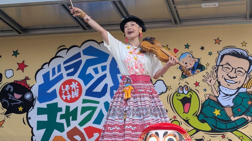 5月に東京の港区立エコプラザで開催された「黒色すみれ音楽会~木で作られた楽器のお話と演奏~」。出演者である黒色すみれさんが、どうでしょうキャラバンを盛り上げるアーティストとして出演する事をきっかけに、ATENOTEのバイオリンを弾いて頂きました