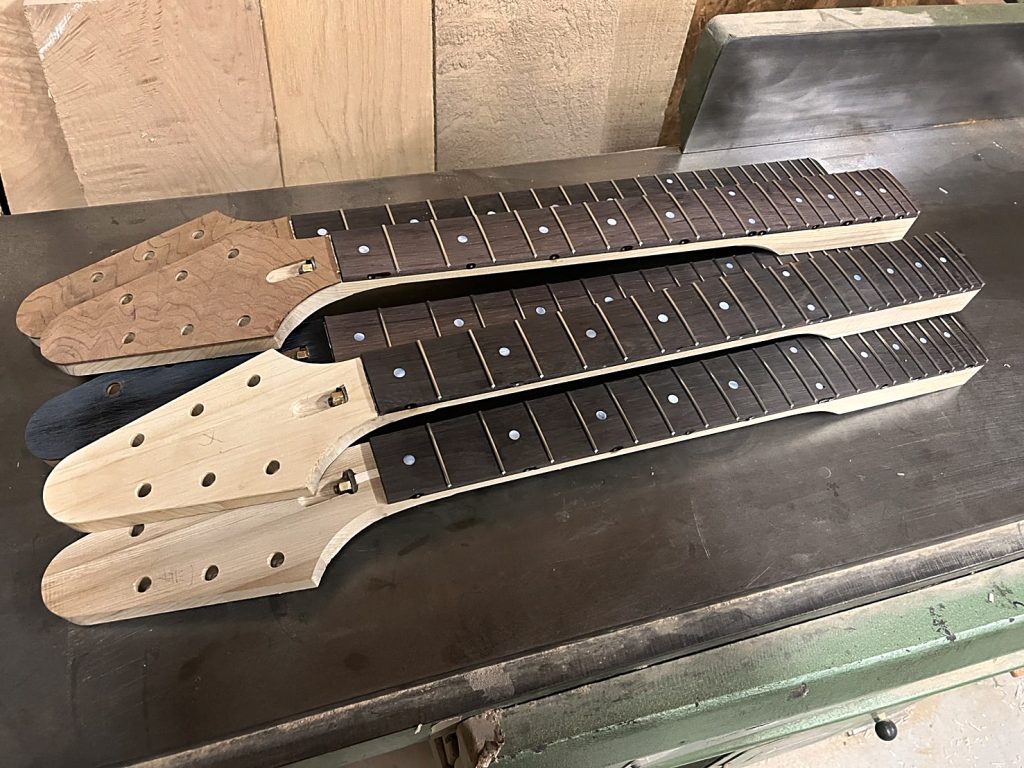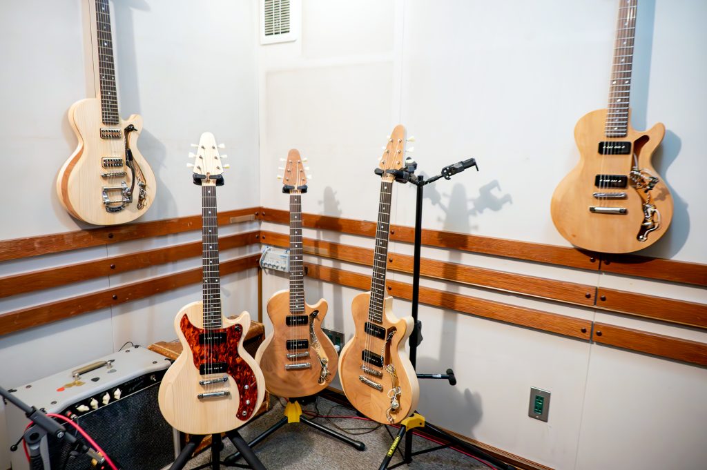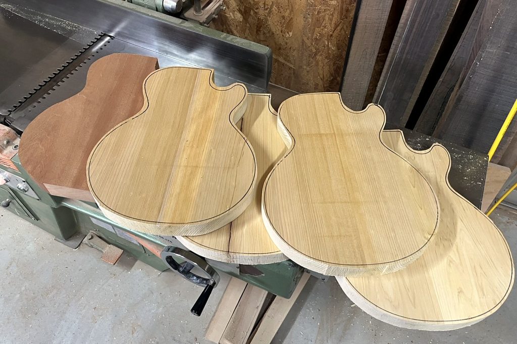 製作自体はEVERTONEチームのWood Custom Guitarsの上田和希氏が担当しました。木材を納品してから約4カ月後の同年9月、完成が近いと連絡が入りました。当初の計画では、同時に3本製作の予定でしたが、新たに追加された1本とマホガニー材で作られた1本の合計5本が作られていました。